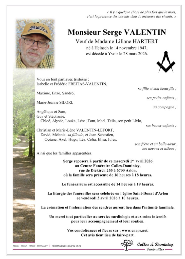 Le président Bernard HEINEN et tous les membres de l'Organe d'Administration de l'association "Les 4A" ont le pénible devoir de vous informer du décès inopiné de leur très cher et regretté Secrétaire Serge VALENTIN.